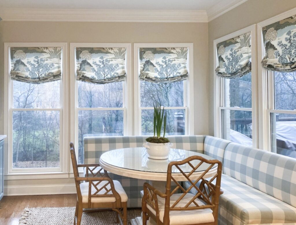 Unless you live in the country, love light streaming in your windows all the time or have no privacy issues you’ll want something on at least some of your windows. Relaxed roman shades are elegant and informal. It can create a very feminine soft look.